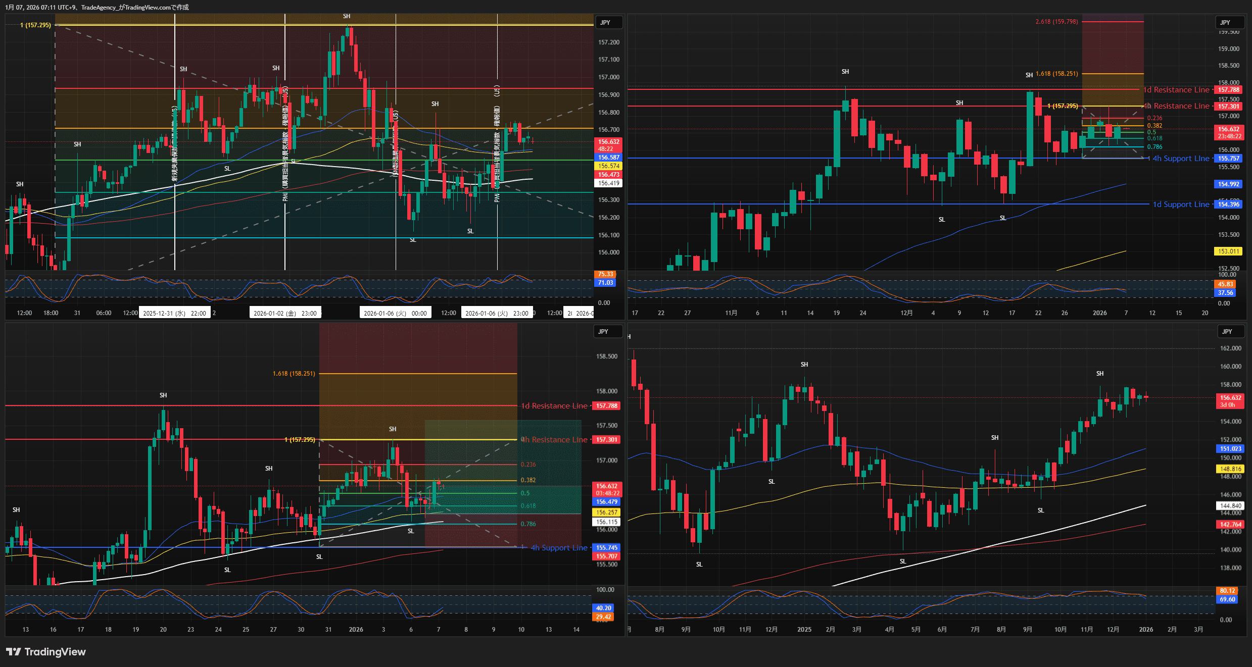 再度0.618~0.786まで戻すようなダブルボトムを形成する流れであれば4hサポートライン(155.739)を損切ラインとしてロングエントリー