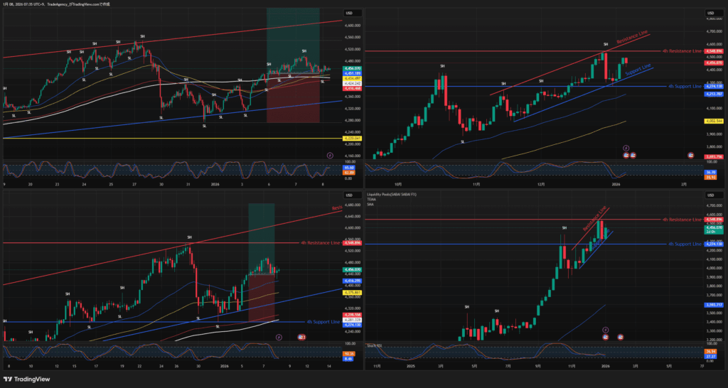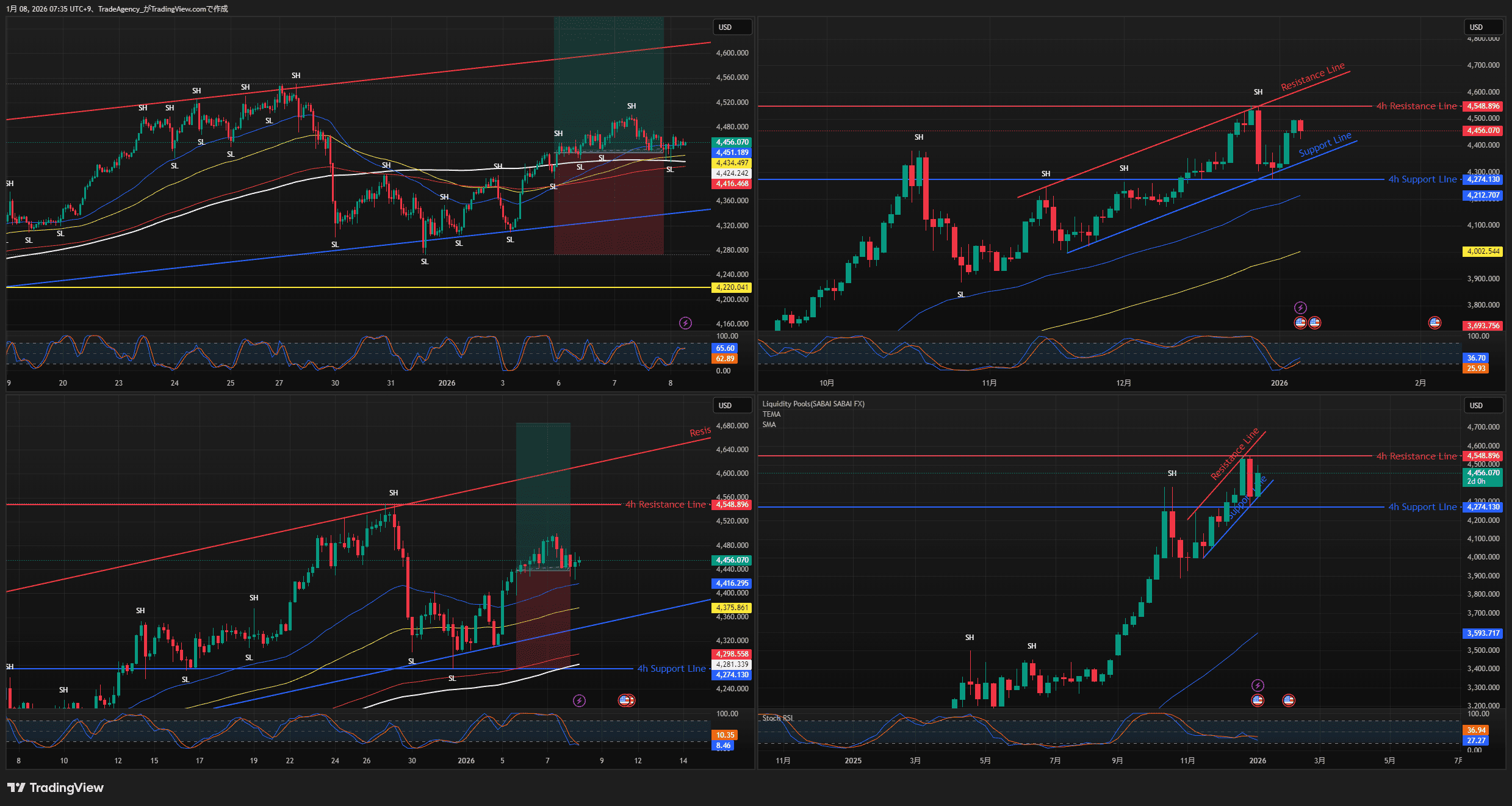 • サポート割れ:4時間足での直近安値サポート $4,416 を明確に下回った場合、目線はフラット〜売りに転換。