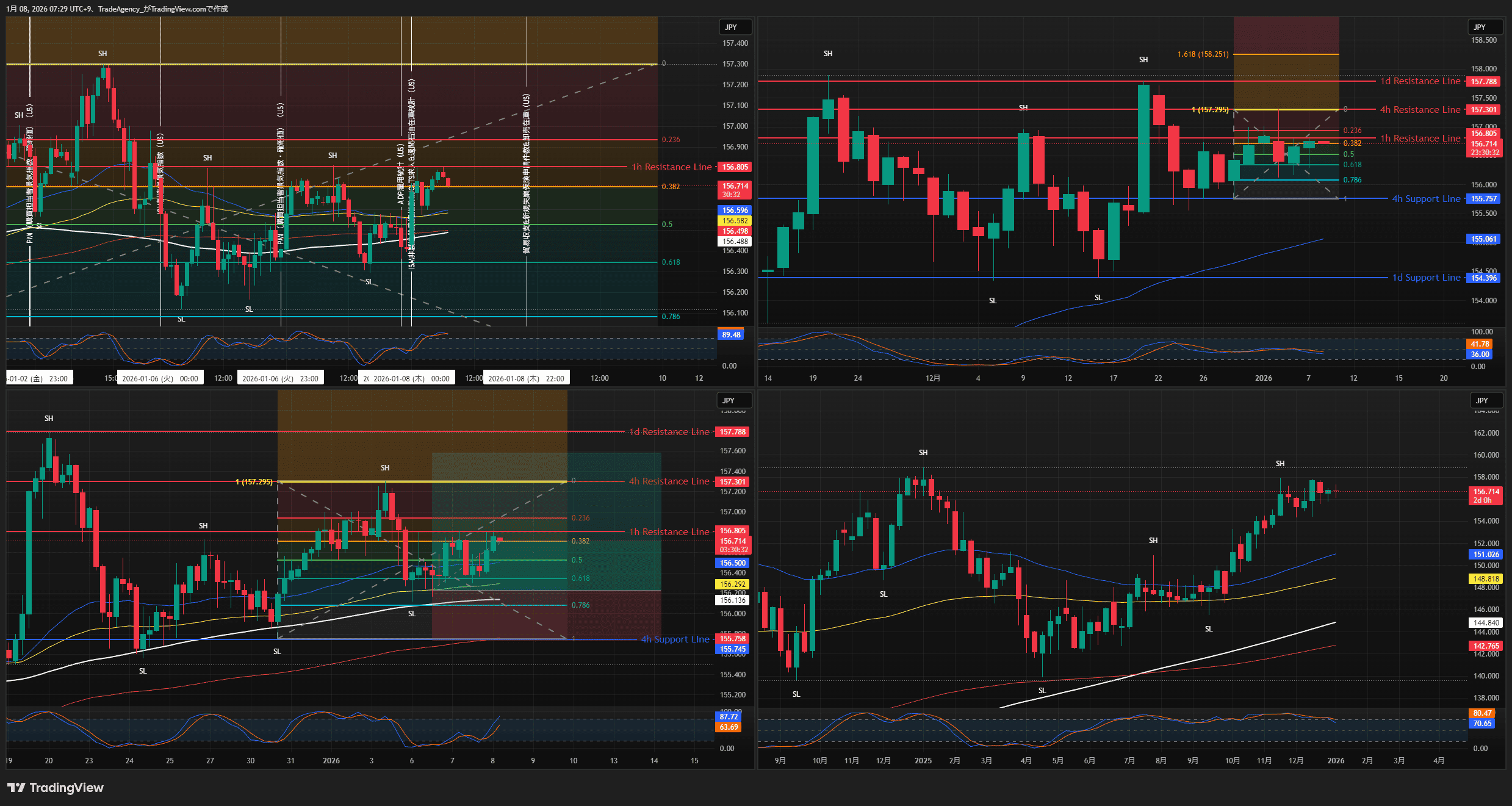 • ターゲット:まずは 155.757 (4h Supp) への回帰。そこを割れば日足サポートの 154.396 を目指す深い調整へ。