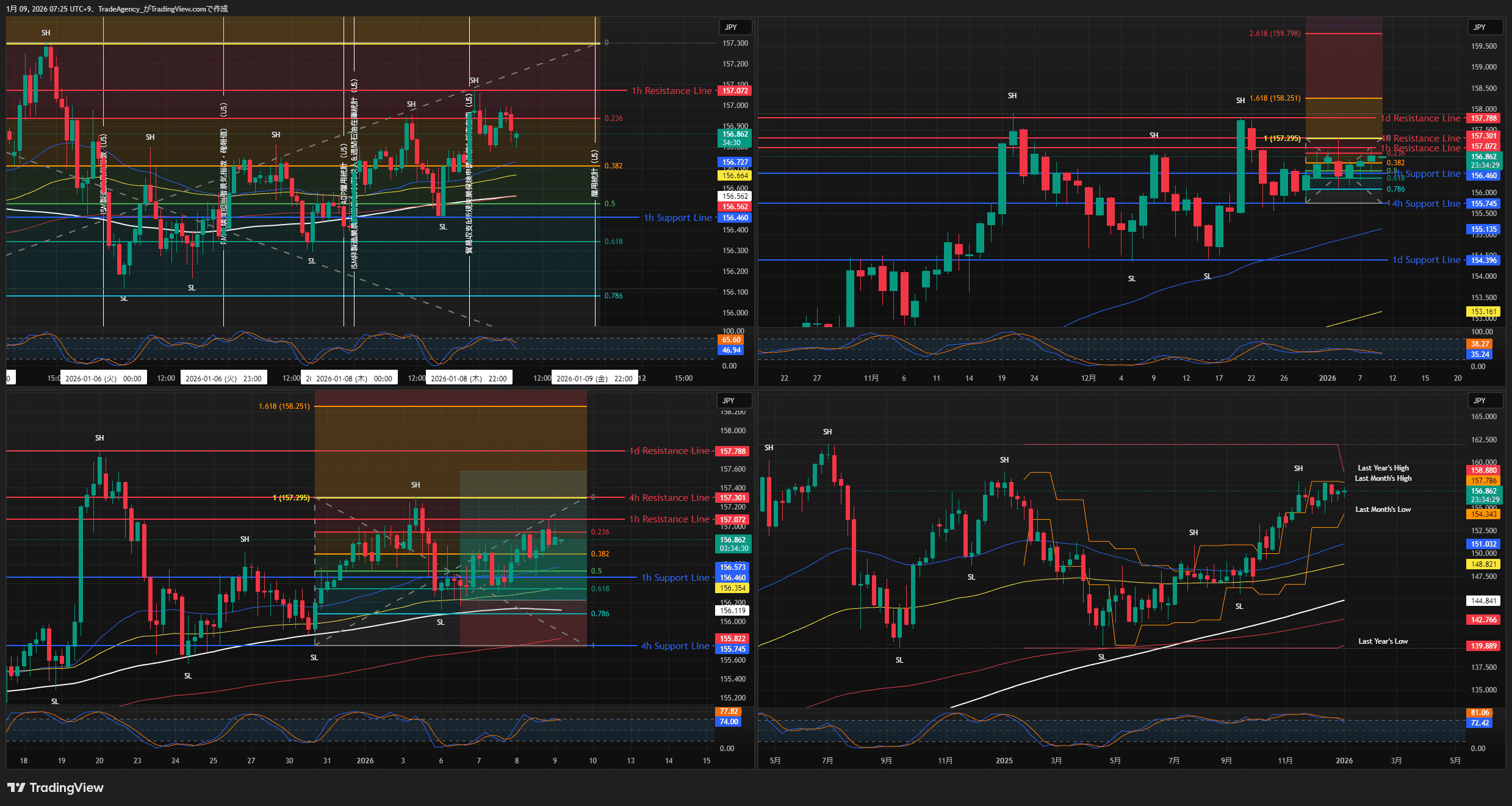 - ターゲット: まずは 156.460 (1h Supp) への回帰。勢いが強ければ 155.745 (4h Supp) まで伸ばす。