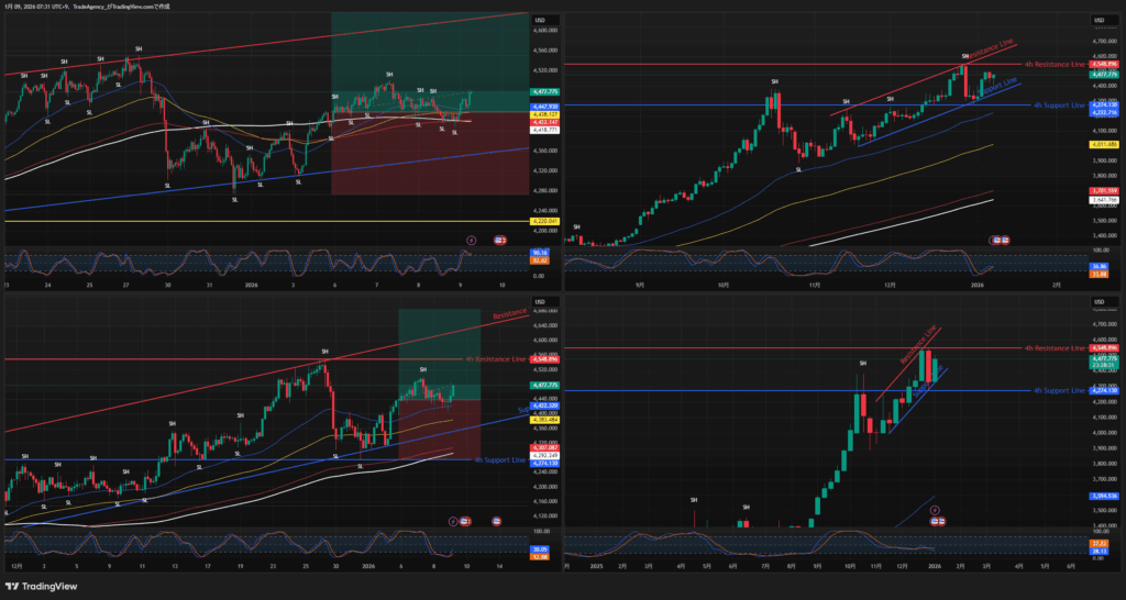 - ターゲット: まずは直近高値の $4,500。そこを抜ければチャネル上限の $4,548 (4h Res) を目指す。