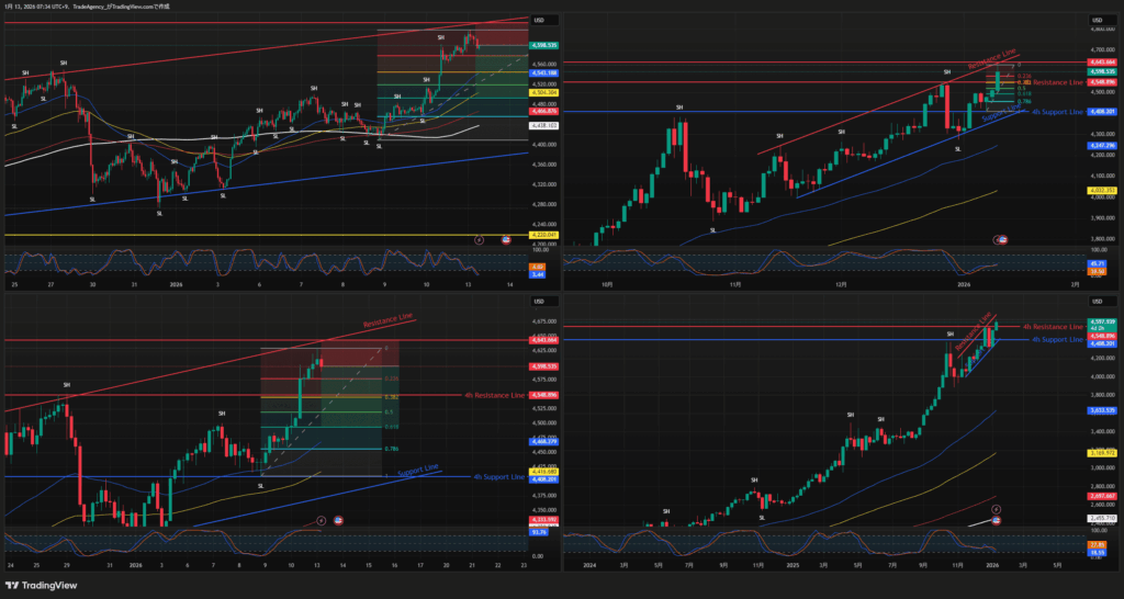 - $4,501 (Fib 1) を割り込むと、一気に $4,408 (次の4h Support) まで値を消すリスクあり。