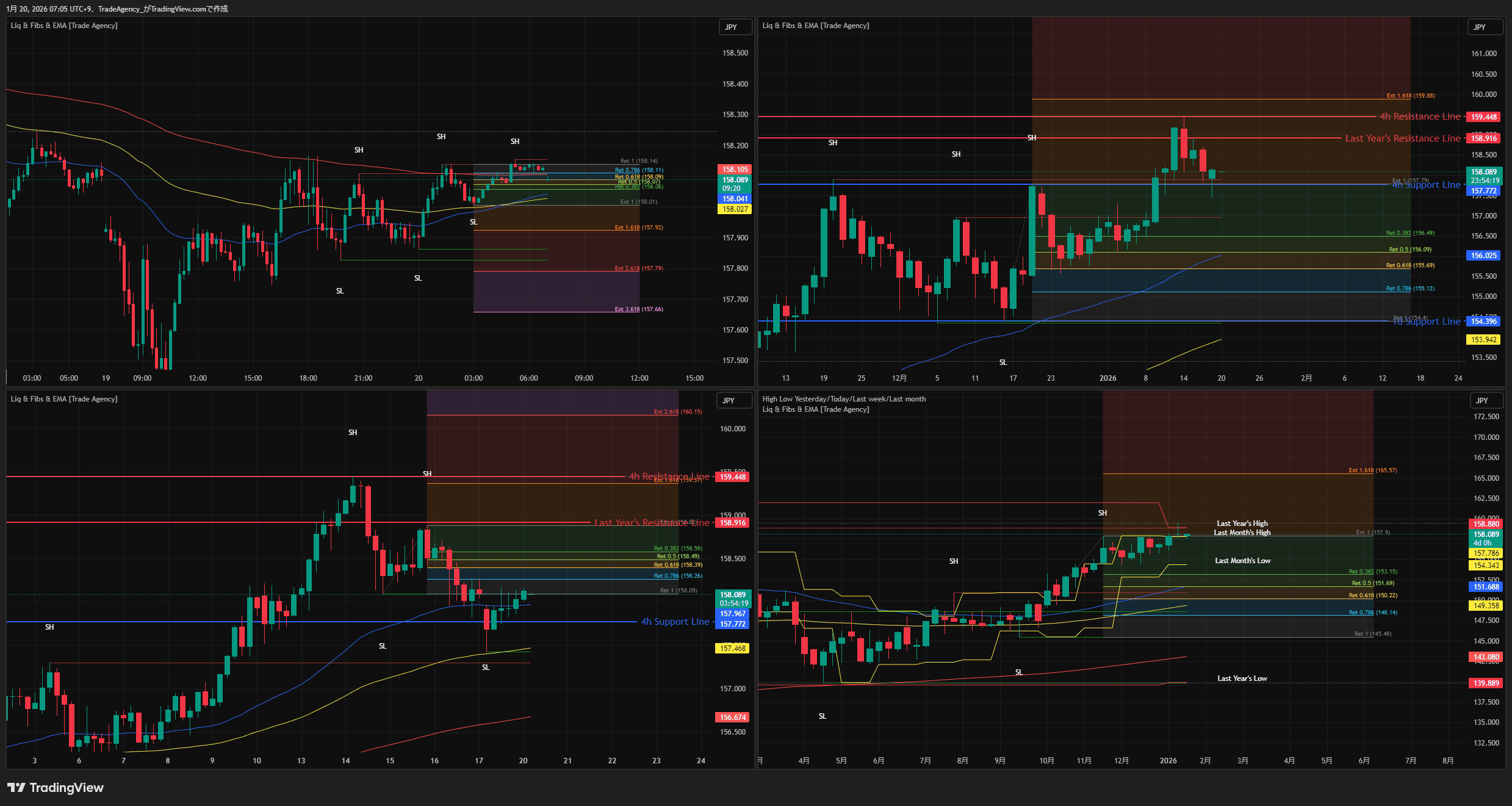 - レジスタンス: 真上のターゲットは Last Year’s Resistance Line (158.916) および4h Resistance Line (159.448)。
