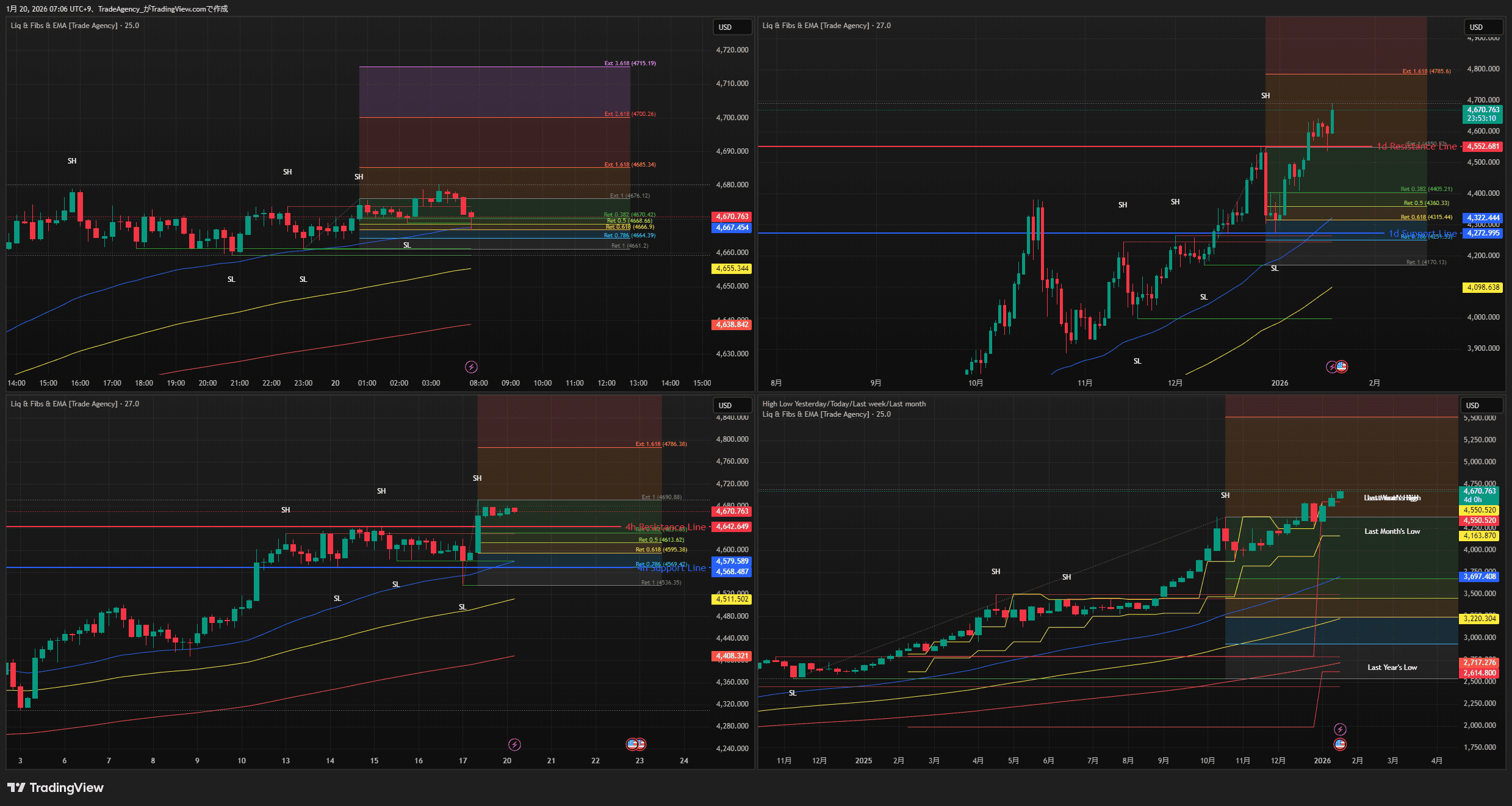 - サポート: 以前の 4h Resistance Line (4,642.649) を明確にブレイク済み。このラインがロールリバーサル(サポレジ転換)するかが最大の焦点。