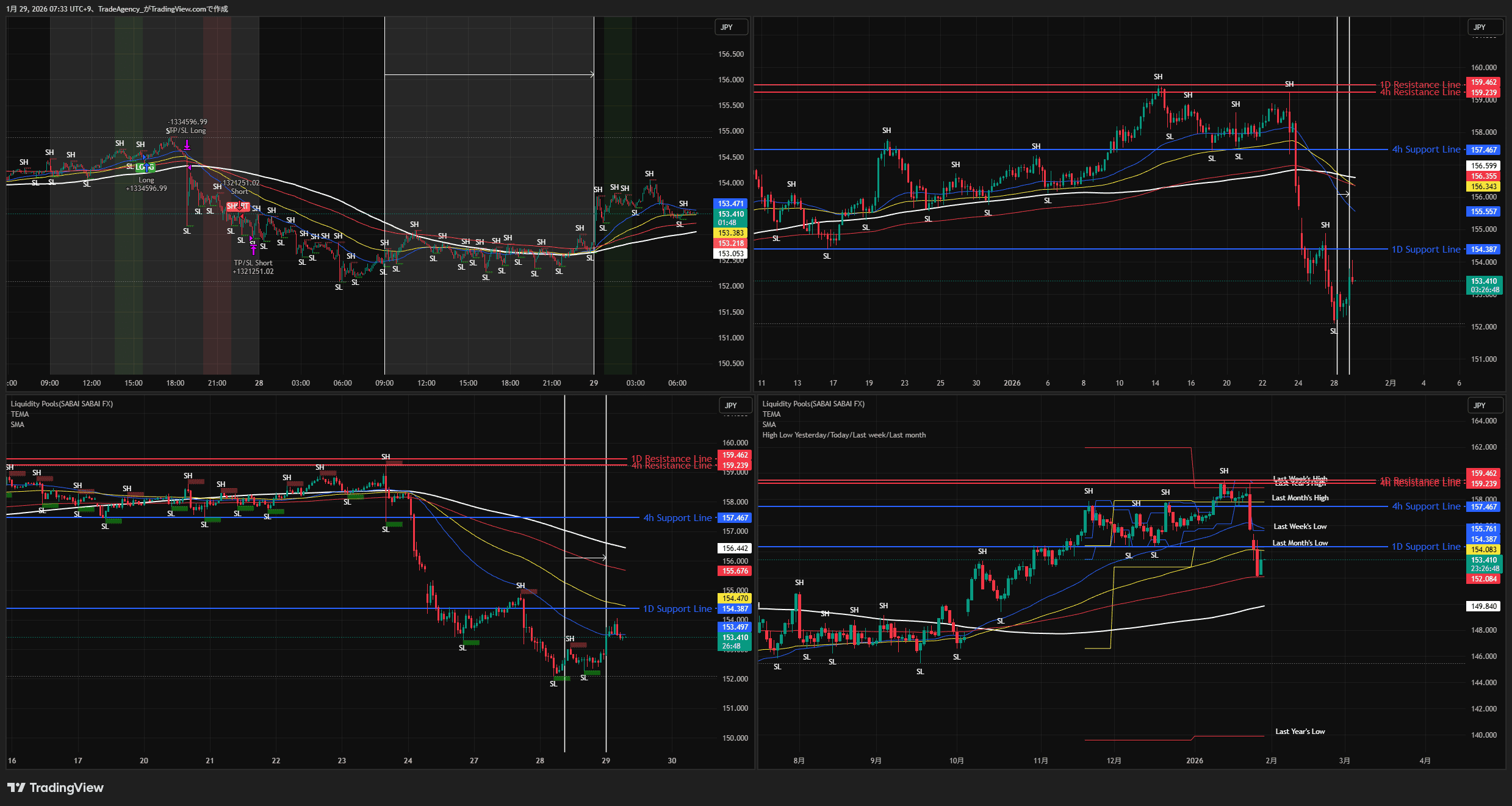 - トレンド: 日足・4時間足ともに完全な下降トレンド。昨日の急落以降、戻り高値を試す場面もありましたが、以前の強力なサポートだった1D Support Line (154.387)が今は重いレジスタンス(サポレジ転換)として機能しています。