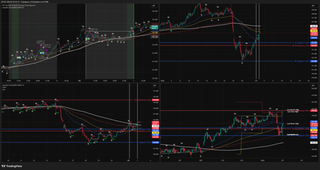 • トレンド: 152.091での底打ちから強力なV字回復を見せ、短期上昇トレンドへ回帰。重要ラインであった1D Support Line (154.387)を実体で上抜け、レジスタンスをブレイクしました。