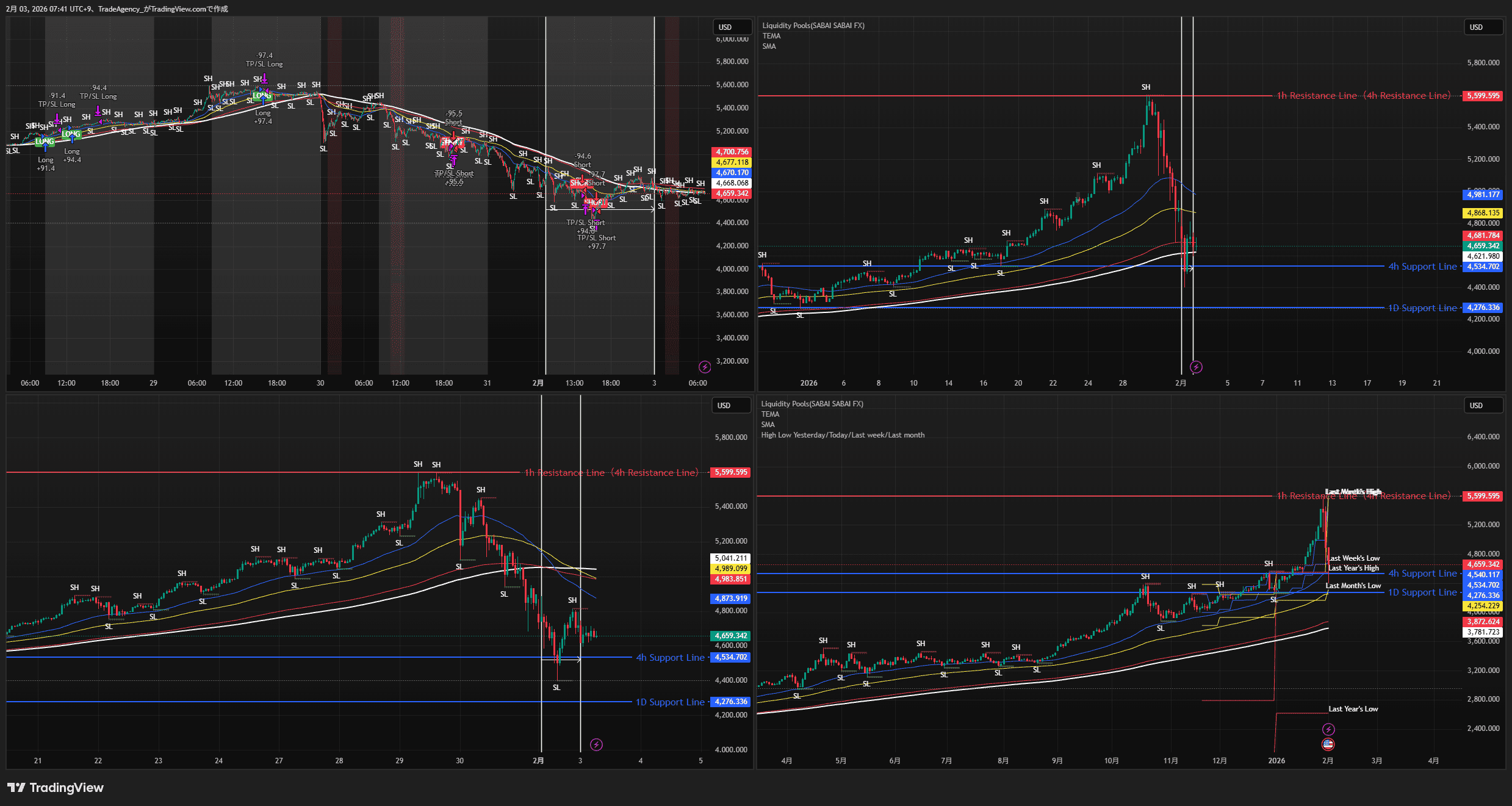 左上:5分足、左下:1時間足、右上:4時間足、右下:日足(クリックで拡大)