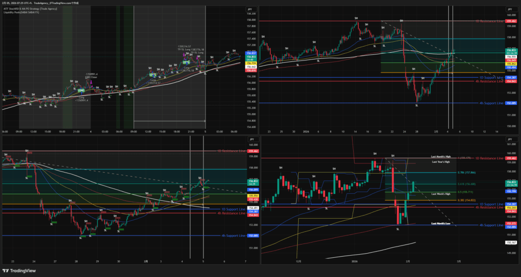 - トレンド: 日足レベルの調整局面(152.00)から一転、強力なV字回復により上昇トレンドへ回帰。直近のレジスタンスであった1D Support Line (154.387)を完全に上抜き、買い圧力が支配的です。