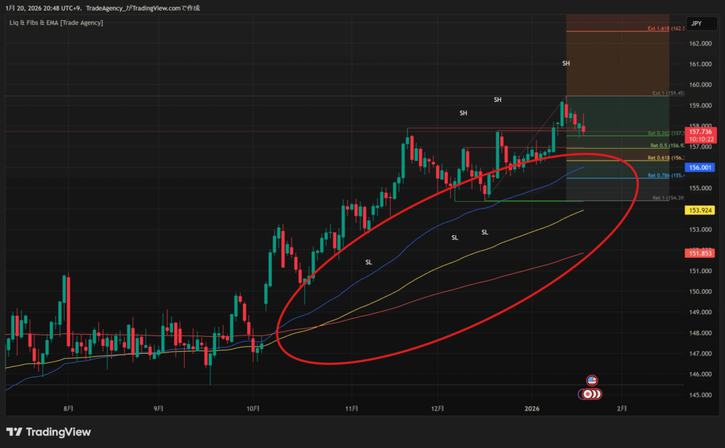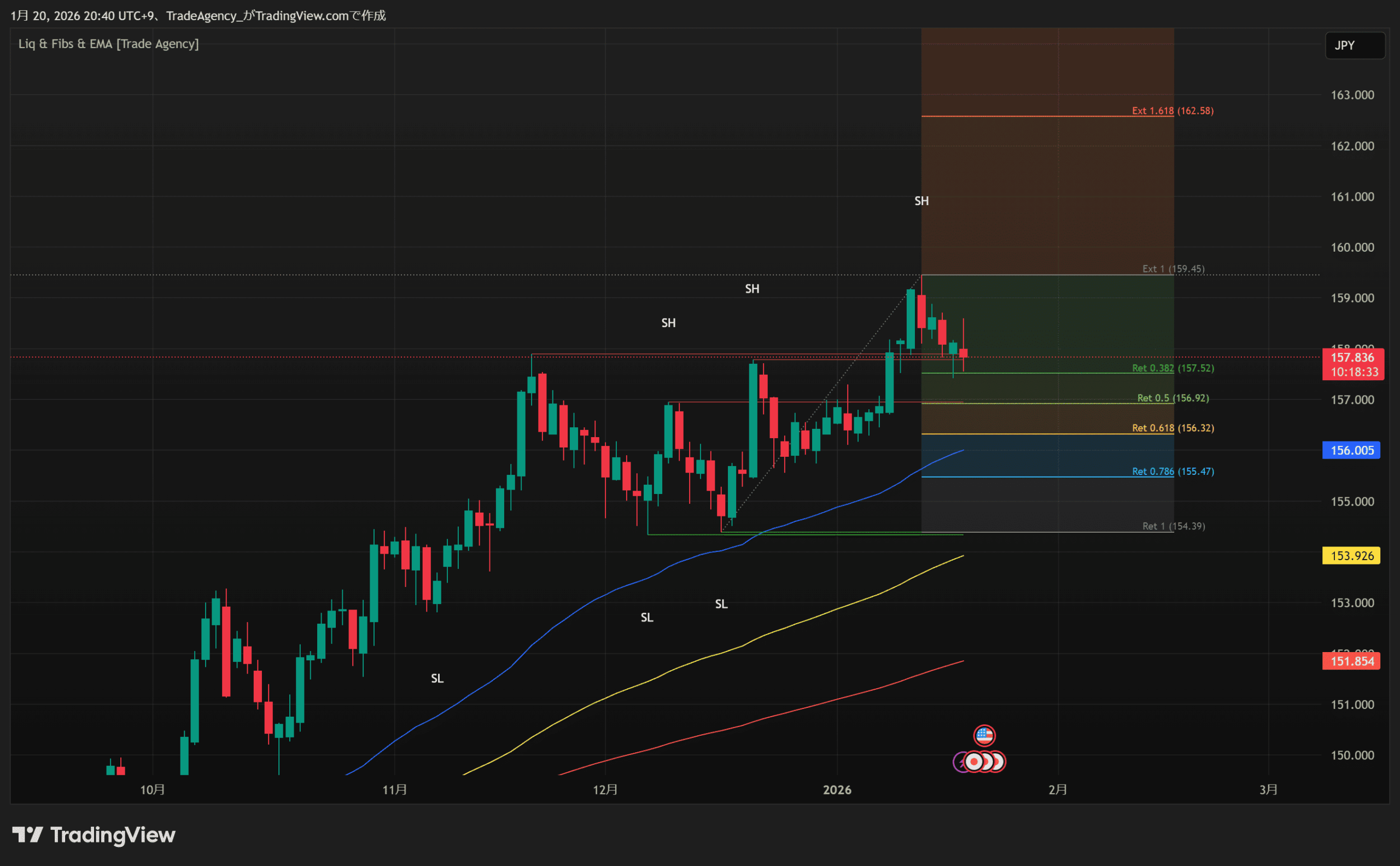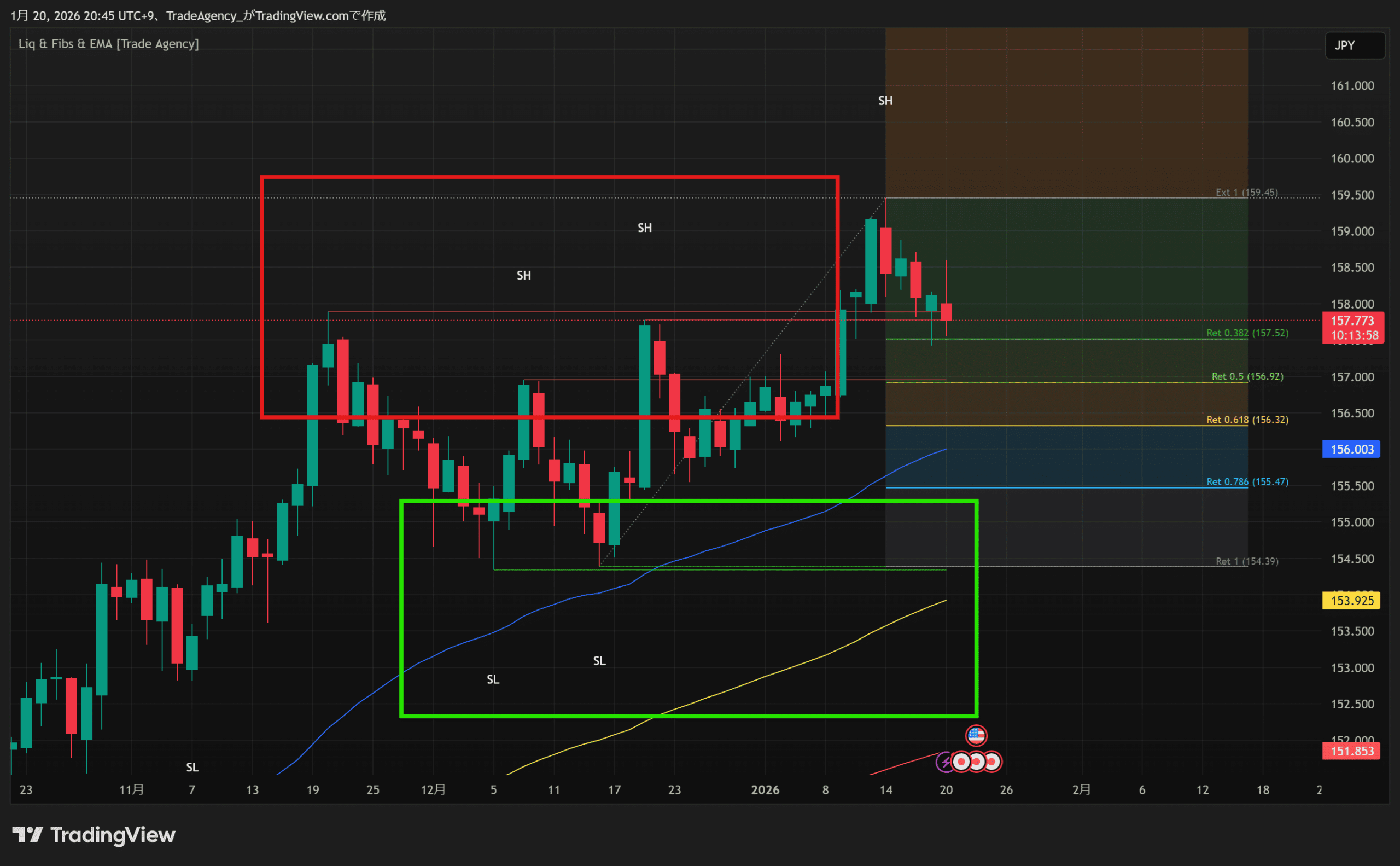 - Extension(利確目標): 1.0, 1.618, 2.618, 3.618 背景色付きのゾーン表示で、視覚的に価格帯を認識しやすくしています。