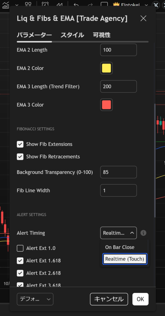 - 200EMAトレンドフィルター: 上昇・下降を自動判定し、適切な方向にフィボナッチを描画