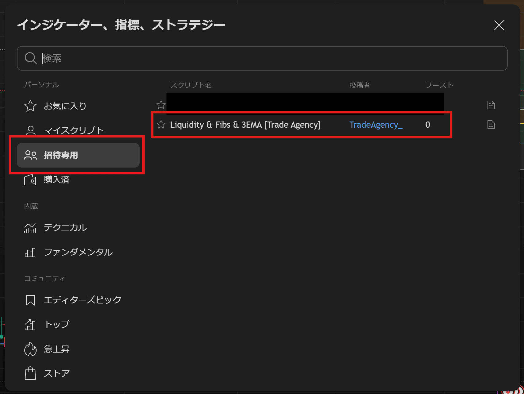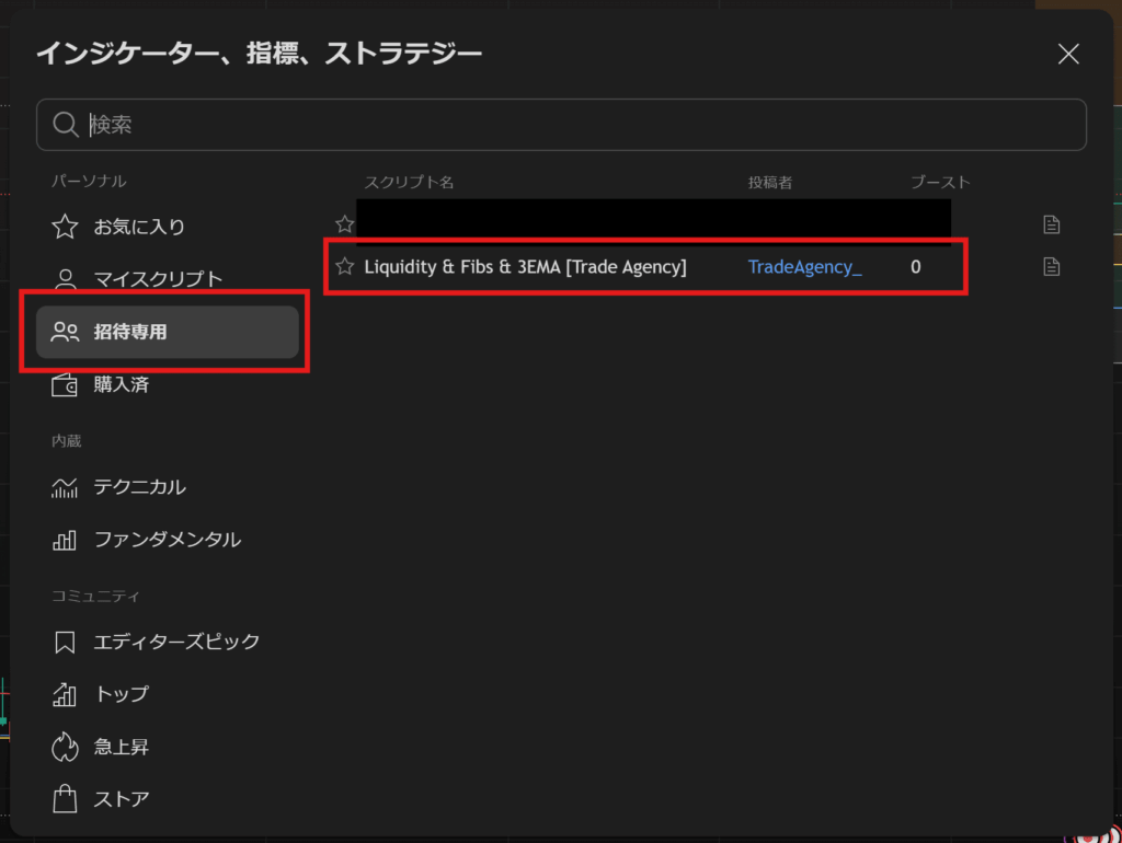 権限が付与されると、TradingViewの「インジケーター」→「招待専用スクリプト」の中に「Liquidity & Fibs & 3EMA [Trade Agency]」が表示されます。クリックしてチャートに追加してください。
